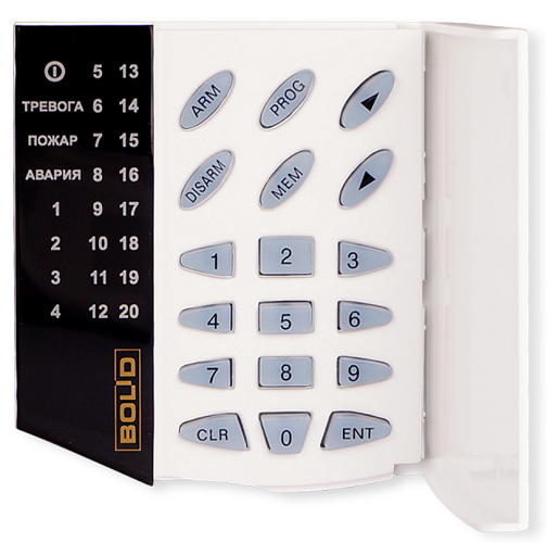 | Индикация | 4 светодиодных индикатора для отображения режимов работы и тревожных событий, 20 двухцветных светодиодных индикаторов для отображения состояния разделов |